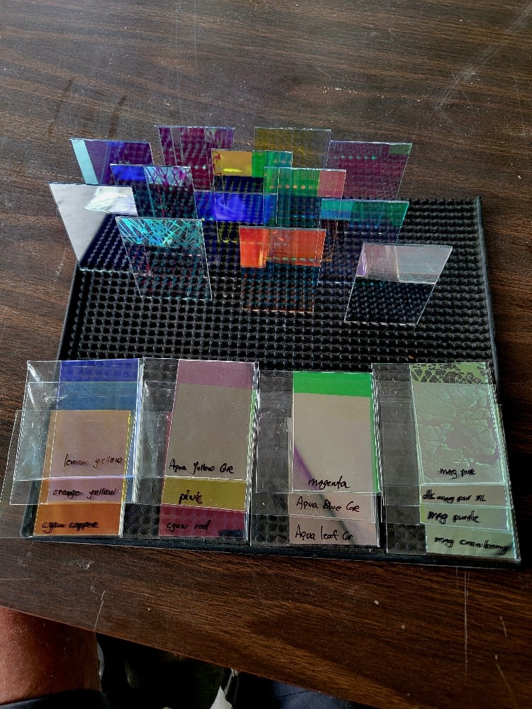 You will get 13 sheets of the 2x3" rectangles of A grade dichroic borosilicate glass in .062mm .. 1 each of 13 different colors for your stained glass applications or coldworking ideas each individually wrapped in a cello sleeve for 1st Grade A quality